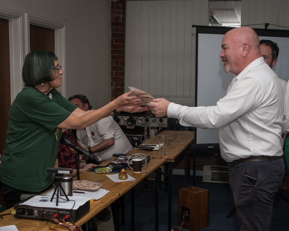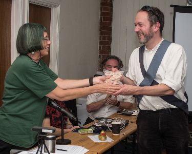 We were delighted that Pauline had been awarded an EFDSS Gold Badge, which was due to be presented at the AGM.  Eliza read the Citation she had written, and showed a slideshow of Pauline she had prepared in various kits through the ages.  Mike Heaney was supposed to present the Gold Badge, but had unfortunately been taken ill and was too unwell to travel that day. So, after a time of panic that morning, Eliza plotted to use a Gold Duck with an EFDSS sword lock on it, as an alternative item, which she had planned to give to Pauline at the Committee meeting.  She asked Frank Lee to present it, to much hilarity from the audience!
